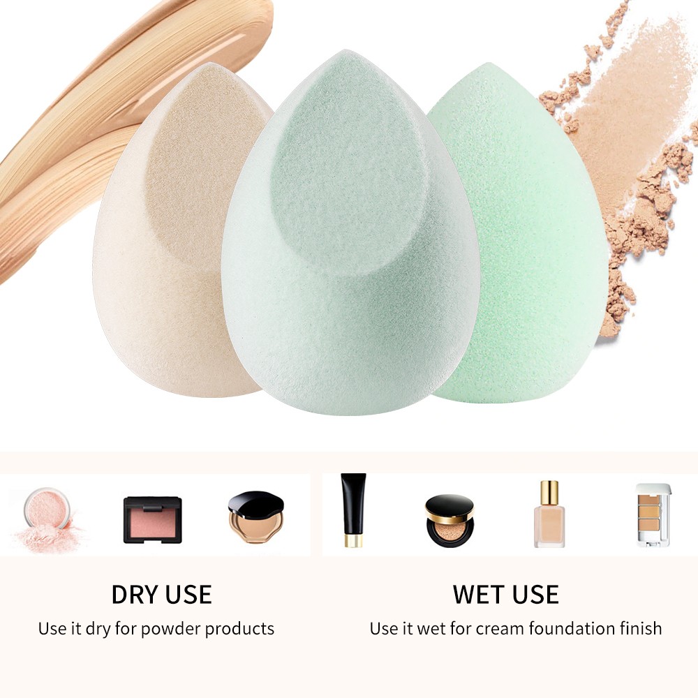 Delicate beauty sponge blenders with high-quality hydrophilic polyurethane core. Soft and bouncy in texture, an easy-to-use tool for every skin type to make flawless and fresh complexion.Classic oval and teardrop shapes perfectly solve any makeup problem, and it is suitable for every angle. The rounded side is ideal for blending foundation on large area. Use the flat edge for contouring. Concealing any flaw with pointed tip.Dual-use in both dry and wet for applying powder, liquid foundation, cream, and concealer. Doubled in size when it is wet, and this ensures impeccable application with minimal product waste. Reusable and durable if wash regularly with neutral detergent.Latex-free & Cruelty-free: Made from innovative non-latex material to prevent allergies. It is vegan as well as cruelty-free. Bring you natural experience and beauty.Certified quality and safety assurance. Professional designer and manufacturer delivers preferred makeup tools for elegant and charming ladies.MaterialLatex-Free Polyurethane Foam.How to Use: 1. Slightly wet sponge with water (do not soak).2. Squeeze out the excess liquid, using a towel if available. 3. Bounce concealer, primer, foundation, powder, cream blush or any other complexion product across the face for flawless results. NOTE: When wet, the sponge will expand TWICE in size {approximately 2"x3"}, great for fast all-over application. As with any other makeup applicator, wash and replace often for best results.